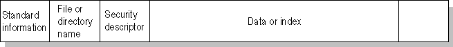 Chaque objet externe reçoit à sa création un numéro qui est l'indice dans la MFT où est situé le descripteur. La taille de ces descripteurs est fixée à la création du volume et est comprise entre 1 koctets et 4 koctets. Un objet externe, fichier ou répertoire, est constitué d'un certain nombre d'attributs qui peuvent être résidents, c'est à dire rangés dans le descripteur de l'objet externe lui-même, ou non résidents et donc à l'extérieur de la MFT dans un espace qui lui est alloué en propre.
