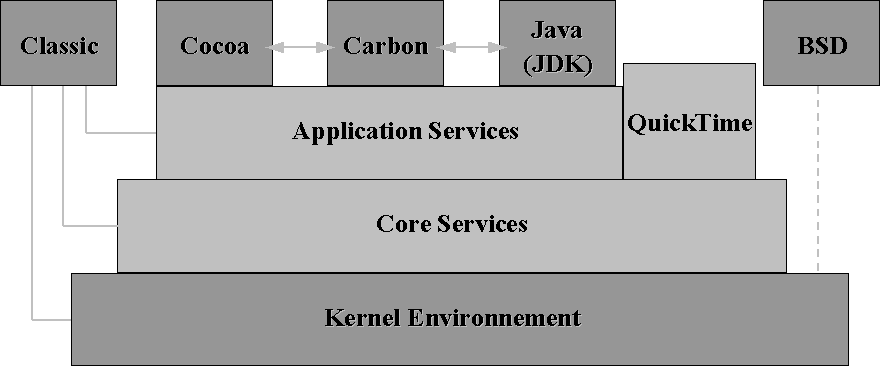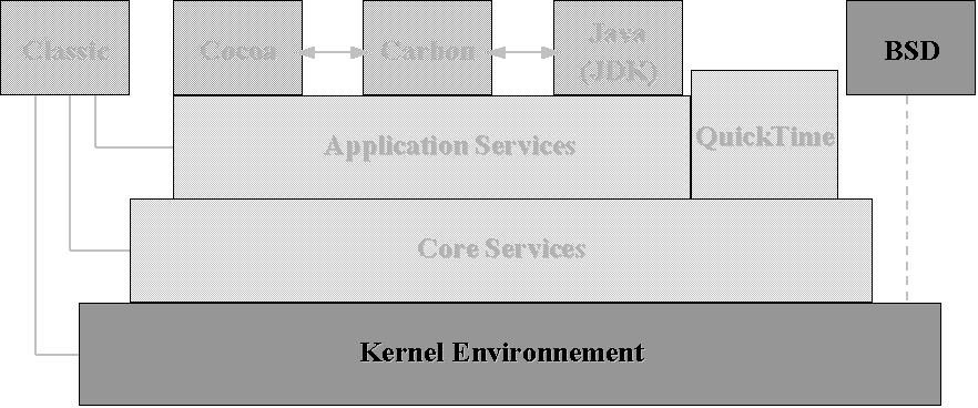 Darwin est le coeur de Mac OS X. Le noyau de Mac OS est strcturé comme ceci :