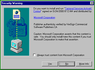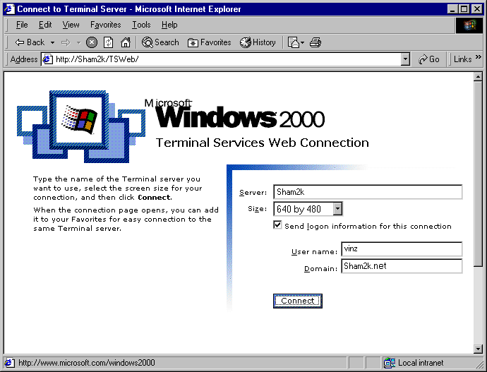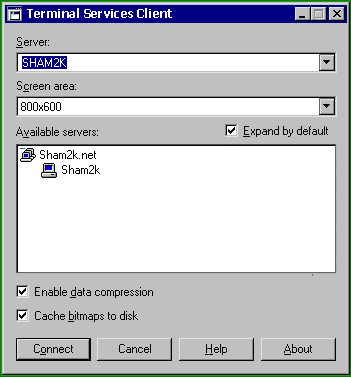 l'installer, ni de l'activer). Il existe deux types de clients pour accéder au Terminal Services : le client classique, dont on peut générer une installation sur disquettes pour l'installer sur les machines et le client avancé (TSAC) qui est basé sur un controle Active X utilisable sous Internet Explorer. Le TSAC est plus souple d'utilisation puisqu'il ne demande qu'un IE pour se connecter à un serveur distant. Il faut auparavant l'installer sur un IIS grâce au TSAC Web Package téléchargeable sur microsoft.com. Le Terminal Services Client Creator se trouve dans les outils d'administration : il permet de se connecter à différentes résolutions, la compression et le cache bitmap sont utiles sur des lignes bas débit pour limiter le trafic et améliorer le temps de réponse (activer par défaut pour TSAC): TSAC ne demande aucune installation préalable si ce n'est le controle Active X : il n' y a plus ensuite qu'a se connecter avec un IE : Améliorer le temps de réponse : Windows 2000 met