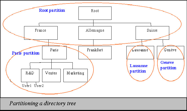 Comme le montre la figure suivante, les partitions sont des sous arbres de la NDS entière. La première partition de l'arbre NDS inclut l'objet root et est appelée root partition.