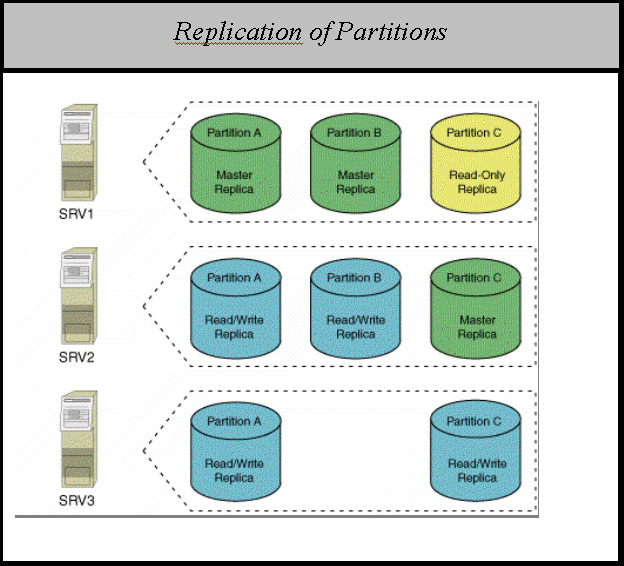 Les partitions crées seront normalement répliquées. Une des raisons pour répliquer la base de donnée est de fournir aux utilisateurs une qualité de service: par exemple, si le réseau Novell est dispersé géographiquement, il est important que l'utilisateur puisse obtenir les informations demandées localement si un lien réseau tombe.