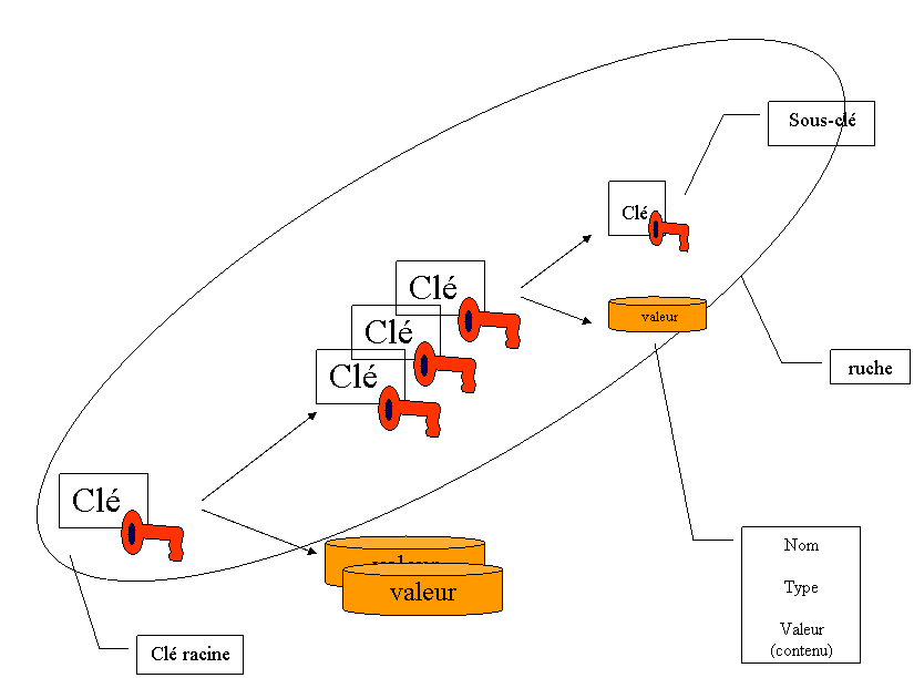 Elle comprend une clé racine et ses sous-clés. Par exemple la ruche SOFTWARE contient la clé HKEY_LOCAL_MACHINE/Software, toutes les clés qui lui sont associées ainsi que les sous clés situées au niveau le plus bas. Une ruche correspond à un fichier disque contenant toutes les données d'une branche. A la différence des fichiers ini, disséminés sur l'ordinateur, les ruches regroupent des données de configuration sous forme de fichier disque.