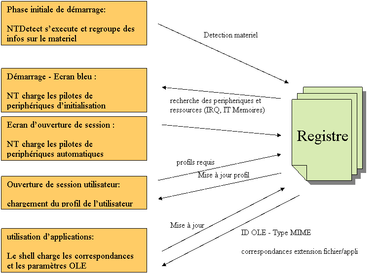 bulletLe regidtre NT joue un rôle essentiel de referentiel de données de configuration. Les composants systèmes y recherche les informations recquises qui determinent les interactions avec les autres composants.