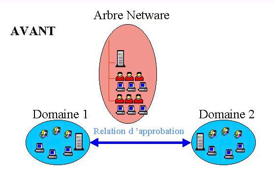 Suite à l'installation de NDS for NT sur chacun des contrôleurs de domaines, les bases SAM de ceux-ci sont remplacés par des pointeurs sur les objets "domaine" de l'arbre Netware. Du coup, la relation d'approbation entre les deux domaines n'est plus nécessaire et même déconseillée par Novell par souci de sécurité.