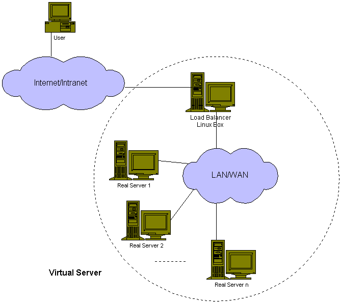 Le principe consiste à interconnecter des serveurs existants, et à orchester la répartition de charge par un node server appelé un load-balnceur ("répartiteur de charge"). Le rôle de ce dernier est d'ordonnancer et de répartir la charge entre les serveurs. Le cluster apparait ainsi comme étant un simple serveur virtuel (l'utilisateur ne voit qu'une seule adresse IP) et donc l'architecture reste transparente à tout utilisateur. Nous pouvons résumer le concept de LVS par le schéma suivant (Schéma provenant du site officielle de LVS) :