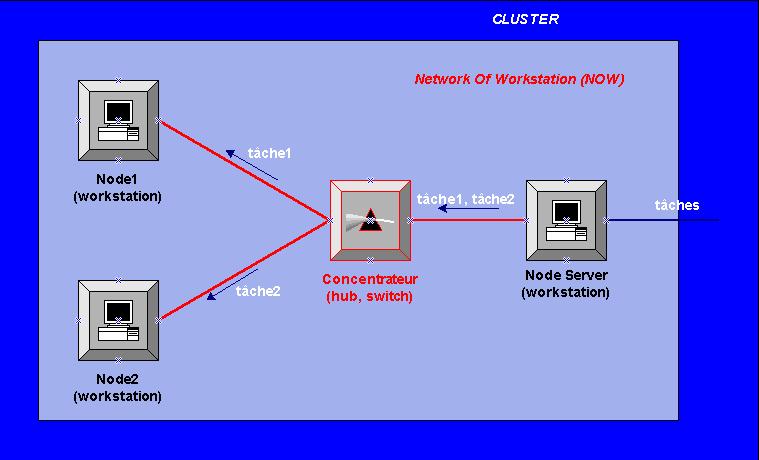 L'interconnection de cet ensemble de nodes et de node server est apelé un Network Of Workstation (NOW, réseaux de stations de travail). En fait il s'agit de connecter tous les nodes du cluster par l'intermédiaire d'un élément fédérateur de niveau 2 comme un hub ou un switch (c'est plus chèr mais meilleur !).