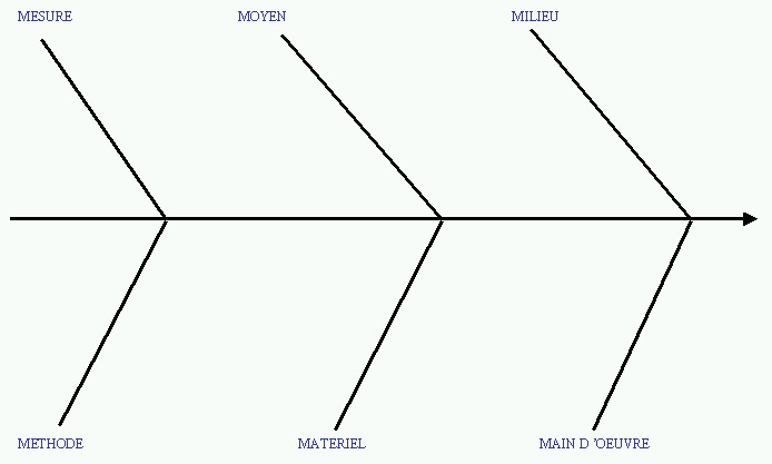 Le diagramme ISHIKAWA (ou arête de poisson) consiste à renseigner, pour chaque arête, les différentes causes relatives aux 6M écrits en fin d'arête (Mesure, Moyen, Milieu, Méthode, Matériel, Main d'oeuvre) qui pourraient nous permettre d'arriver à notre objectif.