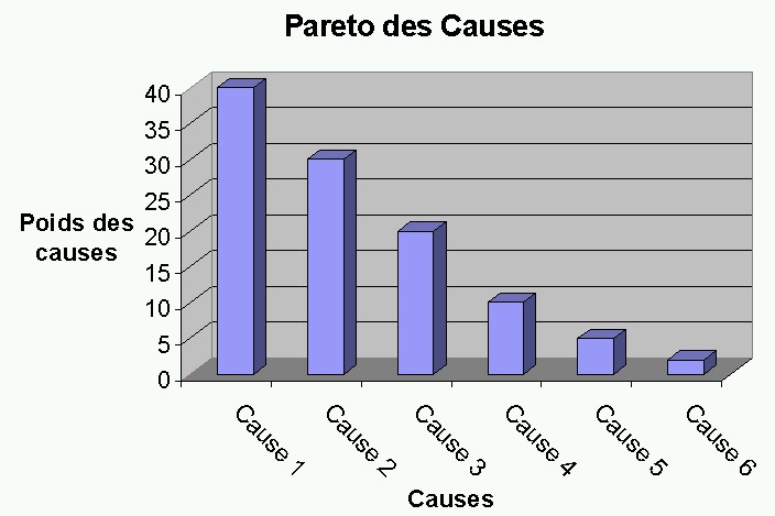 - les Paretos qui permettent de classer les causes de problèmes par ordre d'importance et ainsi de visualiser les causes les plus gênantes. (20% des causes produisant 80% des effets)