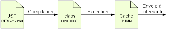 Lors d'une demande d'une page JSP, celle-ci sera compilée en un ".class". Puis le serveur d'application exécutera ce ".class" pour en sortir une page HTML. Ce code HTML sera transmit à l'expéditeur et enregistré dans le cache du serveur. Ainsi, pour une nouvelle demande de la page JSP, le serveur enverra la page stockée dans le cache si le contenu n'a pas été modifié.