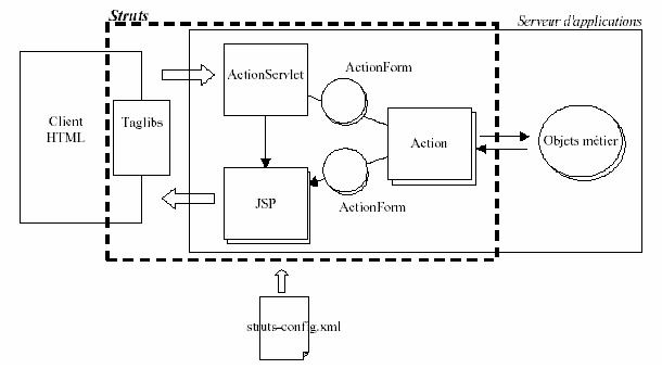 - ActionForm : ce sont des containers pour les pages JSP. Ils peuvent être utilisés par les Action lors du traitement.