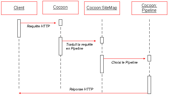 La récupération des requêtes est basée sur ce qu'on appelle des matchers. Le principe des matchers repose sur la reconnaissance d'URI (Uniform Ressource Identifier). Les URI sont des URL qui ne correspondent à aucune page statique mais qui permettent d'envoyer des requêtes sous forme de liens. Shéma du fonctionnement de Cocoon lors d'une requête