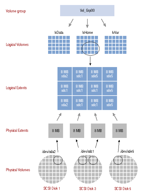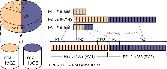 Principe généralLe schéma ci dessous montre le principe global de fonctionnement de LVM : une couche d'abstraction aux disques physiques, mettant à disposition un vaste espace partitionnable. ![]() Il est possible de mettre en place LVM par dessus n'importe quel disque présent sur le système, et non pas uniquement sur des disques IDE ou SCSI indépendants (par exemple sur plusieurs importantes tours de stockage, de manière totalement transparente). Ce système permettant à la gestion de stockage logicielle de faire totalement abstraction du matériel (et inversement), il est possible de modifier la configuration matérielle de manière transparente pour les applications. Détails de l'architectureLe schéma ci dessous détaille l'architecture générale de LVM. ![]() Physical VolumesLes PV, ou volumes physiques, sont les disques physiquement présents sur la machine, ou partitions de ces disques, utilisés pour la Création du groupe de volumes (VG : Volume Group). Physical ExtentsCes volumes physiques sont séparés en PE, ou Physical Extents. La aille d'un PE est par défaut de 32 Mo, personnalisable à la Création du PV (Volume Physique). Volume GroupLes PV forment un ou plusieurs Volume Group(s). Ce sont de gros espaces « partitionnables », composé d'un ensemble de disques ou partitions (volumes physiques) Logical volumesLes groupes de volumes peuvent être séparés en plusieurs volumes logiques (LV). Ce sont les « partitions » du VG. Logical ExtentsEnfin, ces volumes logiques sont composés de LE, logical extents pointant sur des PE. Les tailles des PE et des LE sont donc égales.FonctionnementLes volumes Physiques (PV) sont divisés en Physical Extends (PE) dont la taille est variable, mais identique pour tous les PE d'un meme