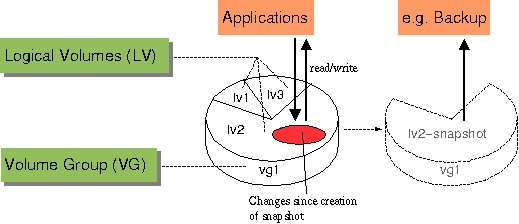 SnapshotsL'utilisation de snapshots consiste à figer un volume logique afin qu'il puisse être sauvegardé, tout en le laissant pleinement accessible. Le snapshot est ainsi une image figée du volume à un instant donné, accessible en lecture seule, et permettant une sauvegarde intégrale de la base à un instant donné. Lors de la création d'un snapshot, le volume effectivement créé ne contient pas réellement les données sauvegardées. La création d'un snapshot revient en fait à figer le volume à sauvegarder pendant son utilisation (le rendre accessible en lecture seule). Les modifications apportées à ce volume sont alors reportées dans le volume créé, correspondant au snapshot. Il est important de noter que seuls les blocs de données ayant été modifiés sont stockées dans ce snapshot. Sa taille correspond ainsi au volume des données modifiées au cours de la sauvegarde. Bien sur, il faut que la taille des modifications apportées ne dépasse pas la taille du volume logique de snapshot créé, auquel cas le volume logique repasse en mode normal, après report des données. Le schéma ci dessous illustre le fonctionnement des snapshots :![]() Création d'un SnapshotLa création d'un snapshot s'effectue de la meme manière que n'importe quel autre volume logique, à la différence près que lors de la création d'un Snapshot avec lvcreate, on spécifie l'option "-s", avec le nom du volume source à la place du groupe de volume : lvcreate -L 700M -s -n backup /dev/bases/base1Cette commande crée un Snapshot permettant de contenir 700 Mo de données modifiées. Pour plus d'informations sur la création de volumes logiques, vous pouvez consulter la section Configuration |