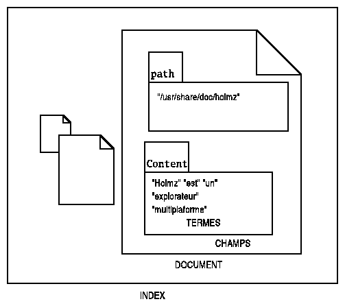 Les principaux objets de Lucene sont : l'index, le document, le field (champs) et le term (Terme ou mot). Sachant qu'un index est une suite de document, un document est une suite de field et un field est un nom associé à une suite de term (un term est une String).