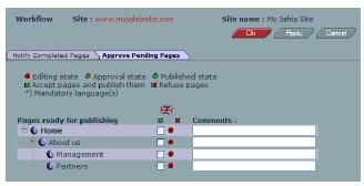 On répète cette opération pour toutes les pages du site. Validation des pagesLorsque l'on ajoute ou modifie des pages, on peut les voir dans l'onglet preview ou l'onglet edit. Cependant, elles ne sont pas immédiatement disponibles sur le site. Pour pouvoir les rendre disponibles, il faut passer par un mécanisme de validation.Dans notre exemple, l'utilisateur est root, ce qui simplifie la manipulation. Mais, une fois le site mis en place, seuls les personnes ayant des droits particuliers peuvent valider les pages d'autres utilisateurs. Ce mécanisme permet d'éviter des dérives dans les informations délivrées par le site. Pour réaliser la validation, il faut procéder de la manière suivante : ![]() Cliquez sur "workflow" dans la barre d'administration. Ensuite, la fenêtre de validation s'ouvre ![]() Dans cette page, il suffit de cocher les cases correspondant aux modifications à valider pour qu'eles deviennent valides. On pourra aussi valider sur plusieurs langues, dans le cas ou plusieurs langages seraient gérés. Mon avis...