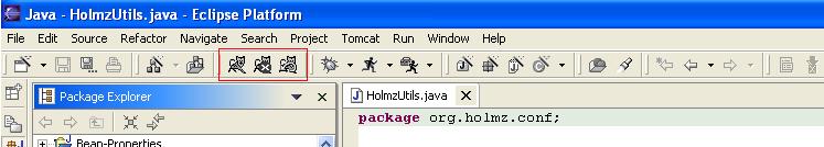 3) La manipulation 2) a pour effet d'afficher dans votre barre d'outils Eclipse les boutons permettant de démarrer, arrêter ou redémarrer Tomcat. Ils sont cerclés de rouge sur la capture suivante :
