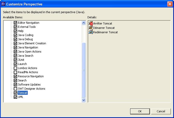 2) Dans le menu "Window", sélectionnez "Customize Perspective...". Cliquez sur "Other", et cochez la case "Tomcat".