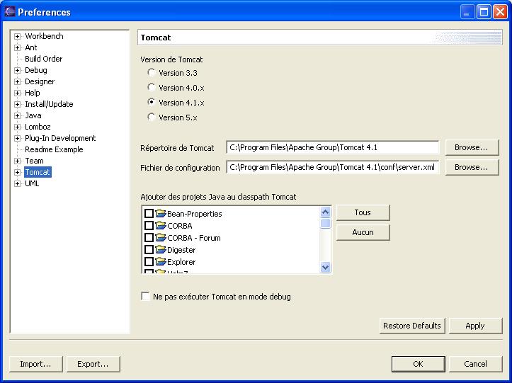 1) Affichez la boîte de dialogue "Préférences" d'Eclipse (menu Window -> Preferences). A gauche, vous pourrez accéder à la page de configuration du plug-in, en cliquant sur "Tomcat". A partir de là, cochez le case correspondant à votre version du serveur (notez que le plug-in, à partir de sa version v221, fonctionne avec Tomcat 5). Vous devez ensuite fournir le répertoire d'installation de votre Tomcat (ce que nous avons déjà appelé TOMCAT_HOME). L'emplacement du fichier de configuration server.xml est alors supputé automatiquement. Modifiez-le s'il est incorrect . Vous pouvez enfin ajouter des projets au CLASSPATH de Tomcat, ce qui permettra de rendre accessibles les ressources desdits projets à vos applications web.