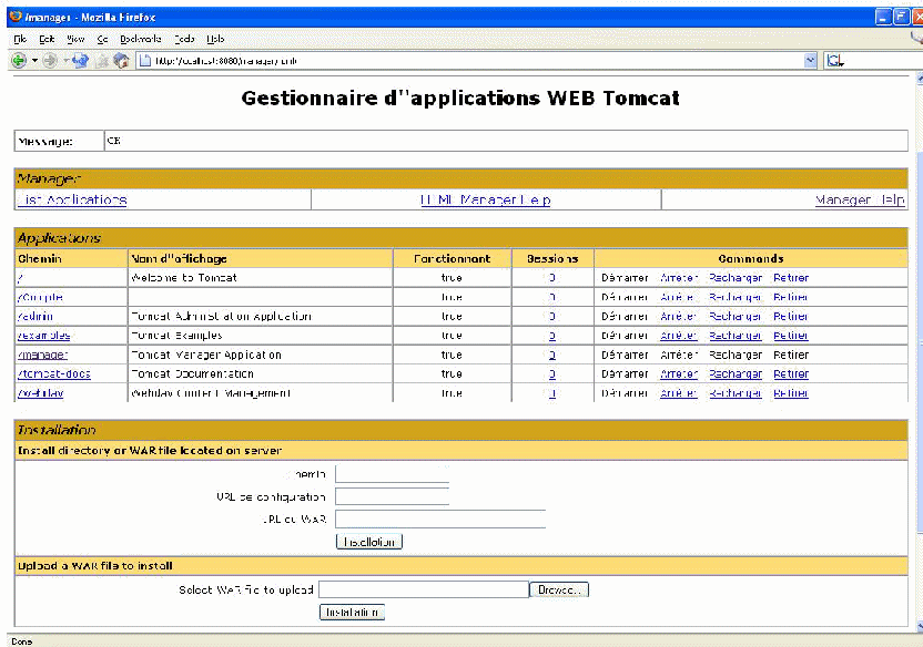 Tomcat propose une application nommée "Manager", et déployée par défaut sous "http://server:port/manager/html". Elle permet d'effectuer différentes tâches d'administration sur les applications web du serveur, notamment les démarrer ou les arrêter. En outre, elle autorise le déploiement d'une nouvelle application web à partir d'une archive WAR, déjà présente sur le serveur ou uploadée depuis une machine distante. L'autre force de ce "Manager" est qu'il n'oblige pas à redémarrer le serveur après un déploiement.