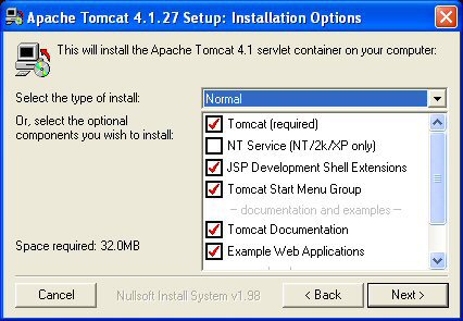 Sous Windows, l'installation est bien sûr graphique. L'essentiel de la procédure consiste à cliquer sur 'Suivant'. La figure 1 propose les options d'installation de Tomcat. Celle qu'on ne voit pas (tout en bas de la liste) permet d'installer les sources du programme. Les autres parlent d'elle-même. L'installation du service NT est intéressante en environnement de production. Elle permet le lancement du serveur en tâche de fond (sous Unix, on dirait un daemon), dès le démarrage de Windows. Par contre, dans un environnement de développement, cela s'avèrera moins pratique, étant donné qu'on sera régulièrement amené à redémarrer le serveur.