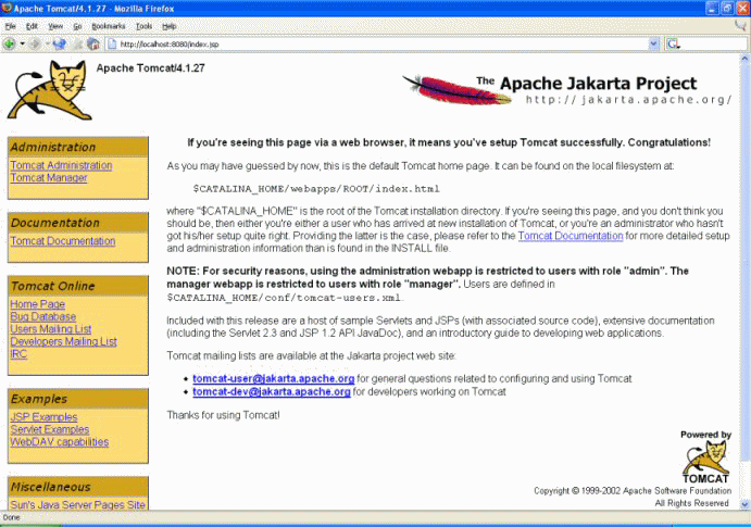 Passons maintenant au test du serveur (se référer aux résultats attendus présentés dans la partie Installation sous Windows juste au-dessus). Nous appelons TOMCAT_HOME le répertoire d'installation de Tomcat. Tout d'abord, il faut démarrer le serveur, grâce au script TOMCAT_HOME/bin/startup.sh. Testons ensuite que Tomcat fonctionne en tapant dans un navigateur l'URL http://localhost:8080/.