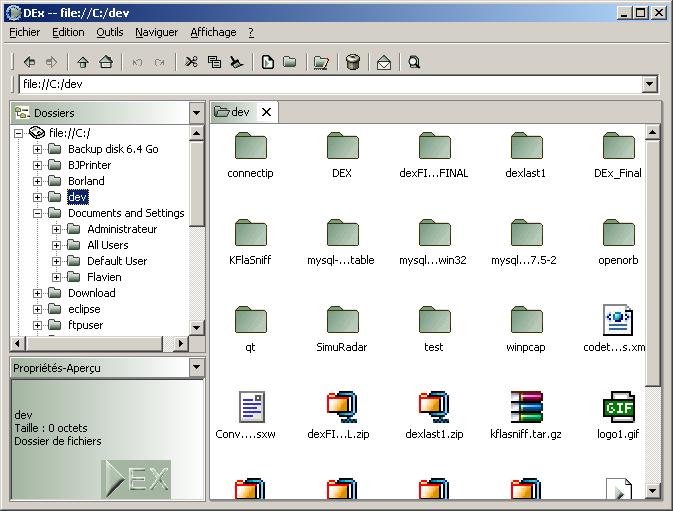 Exemple d'utilisation completDans le cadre de notre projet de génie logiciel nous avons très largement utilisé l'API VFS pour réaliser un exporateur de fichier en java. Cet explorateur est donc multi-plateforme et permet d'explorer le contenu d'un système de fichier local, ftp ou smb. Ce logiciel est une belle démonstration des capacités de VFS. Ce logiciel (sources + binaires) est téléchargeable sur http://etudiant.univ-mlv.fr/~spitoise/dex Utilisation et modification de VFSVFS a très largement été utilisé