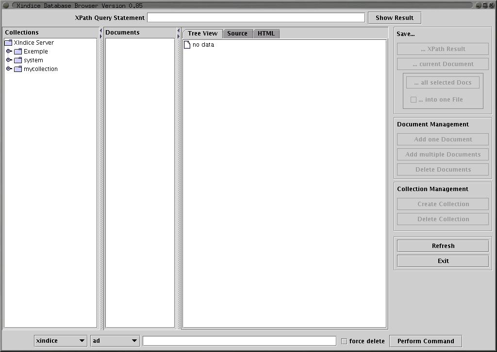 Cette interface est facile à installer et à utiliser, elle est en effet très simple. Elle est recommandée pour les premiers pas avec Xindice. Par contre, comme on ne dispose pas de toutes les commandes, une utilisation professionnelle de cette interface n'est pas forcément recommandée.
