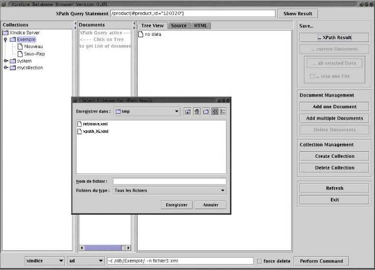 XindiceBrowser ne permet pas de réaliser toutes les commandes existantes sous Xindice, notamment tout ce qui concerne la gestion des indices et les import et export de fichiers. Par contre, il possède une fonctionnalité supplémentaire, en ceci qu'il permet d'enregistrer le résultat d'une requête XPath dans un fichier.
