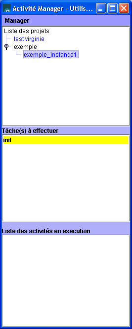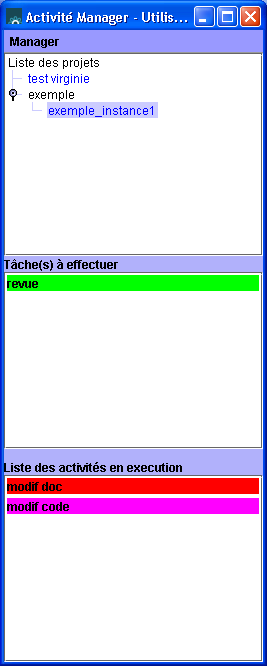 En effet, lorsqu'un utilisateur se connecte à l'activité manager, il voit apparaitre trois parties. La première contient la liste des projets en cours. La deuxième partie, qui est, comme la troisième, spécifique à l'utilisateur, contient la liste des tâches qu'il doit effectuer. Et la troisième partie contient la liste des activités en cours d'execution. l'utilisateur peut alors en utilisant le menu contextuel(clic droit) définir l'état de l'activité sélectionnée. S'il sélectionne une activité à effectuer, il peut la démarrer. Et s'il sélectionne une tâche en cours d'execution, il peut la terminer ou l'annuler.