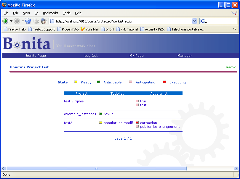 La partie interface Web est très pratique car accessible depuis n'importe quel poste possédant un navigateur Web. Elle permet de visualiser l'ensemble des projets en cours, d'accéder à l'activité Manager et après identification de visualiser toutes les activités relatives à l'utilisateur connecté. Sur l'exemple ci-dessous, vous pouvez visualiser rapidement toutes les tâches en cours de réalisation et les tâches à réaliser par l'utilisateur "admin" dans les différents projet auxquels il participe.