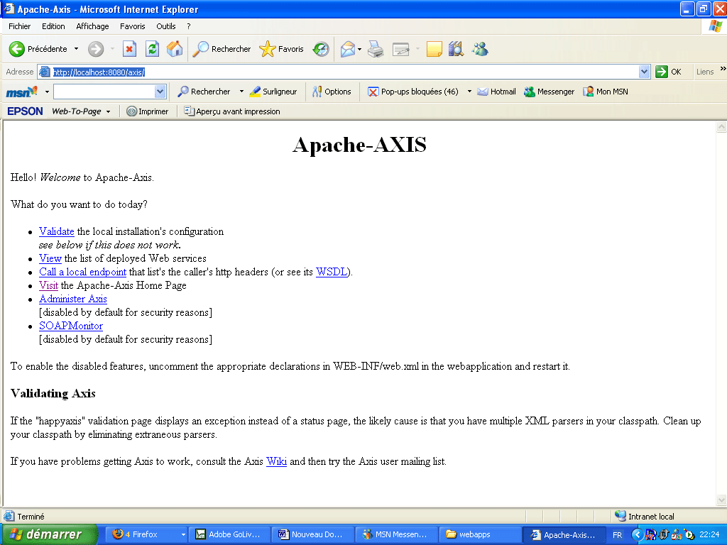 Si l'installation est bien faite le lien suivant devient actif : http://localhost:8080/axis/ et on doit obtenir cette page d'accueil ci: