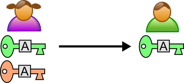1e étape : Alice génère deux clés. La clé publique (verte) qu'elle envoie à Bob et la clé privée (rouge) qu'elle conserve précieusement sans la divulguer à quiconque.