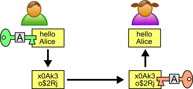 À partir d'une telle fonction, voici comment se déroulent les choses : Alice souhaite pouvoir recevoir des messages chiffrés de n'importe qui. Elle génère alors une valeur à partir d'une fonction à sens unique et à brèche secrète à l'aide d'un algorithme de chiffrement asymétrique (liste ici), par exemple RSA.