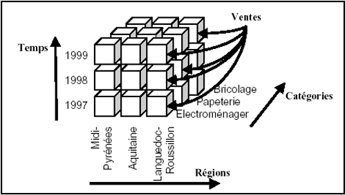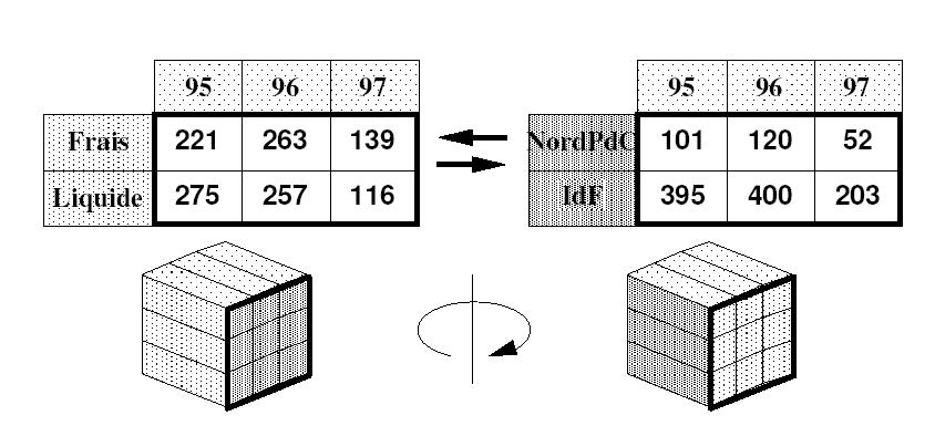 On utilise pour cela des hypercubes OLAP. Les données sont représentées