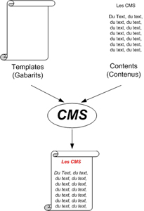 Le CMS joue un rôle de frontières entre ces deux mondes. Lorsqu'un client va demander une page du site au CMS. Celui-ci va rechercher les données demandées, ainsi que les gabarits associés et les fusionner ensemble pour rendre la page du site.