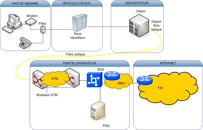 BAS | Le Broadband Access Server assure plusieurs fonctions. Il permet d'assurer la liaison vers les FAI (Fournisseur d'Accès Internet) au travers du réseau de collecte IP. Pour cela, il route les paquets en fonction de leur adresse IP. Inversement, il est chargé de répartir le flux Internet sur le réseau ATM en direction des DSLAM Il assure également le lien avec le PAS pour l'authentification et la facturation. |