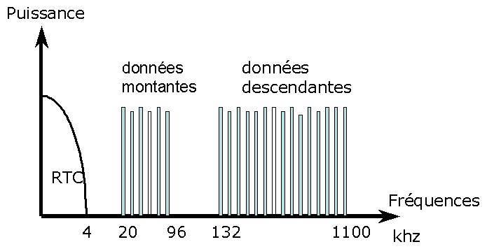 - 5 à 20 KHz : une bande de fréquence laissée vide pour séparer les données téléphoniques et les données Internet