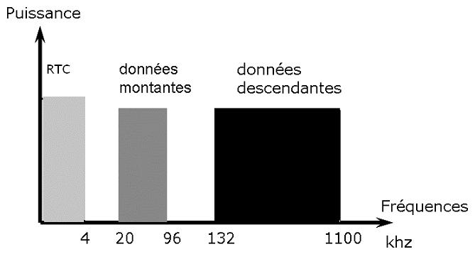 Pour ce faire, l'ADSL utilise le multiplexage fréquentiel. C'est à dire que la bande passante du support va être divisée en trois largeurs de fréquences différentes :
