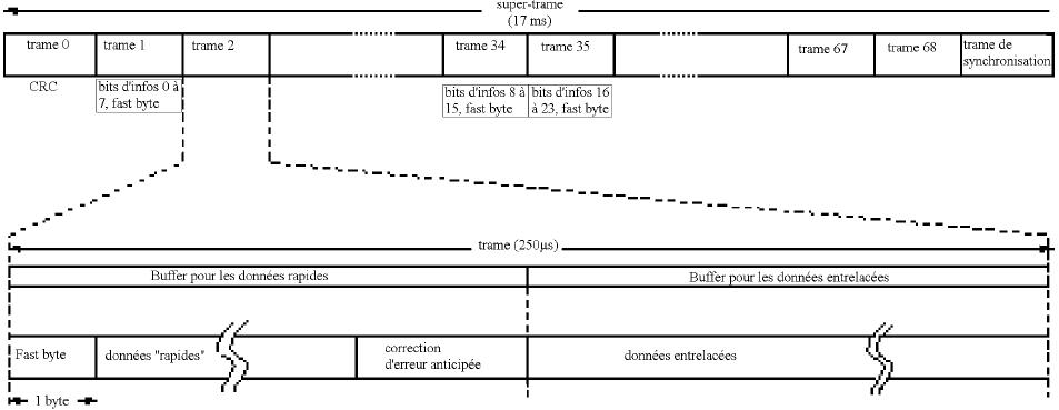 - La super trame est composée de 68 trames ADSL. La première trame contient les corrections d'erreurs CRC et les trames 1, 34 et 35 contiennent des informations concernant la gestion de la liaison. La dernière trame est une trame de synchronisation. Une super trame est émise toutes les 17ms.