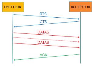 - Le récepteur (généralement un point d'accès) répond un Clear To Send (CTS, signifiant Le champ est libre pour émettre), puis la station commence l'émission des données.