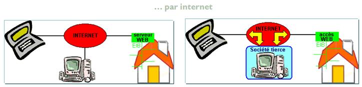 Communication directe par Internet : un serveur Internet de pages Web est nécessaire sur l'installation EIB/KNX que l'on désire atteindre.