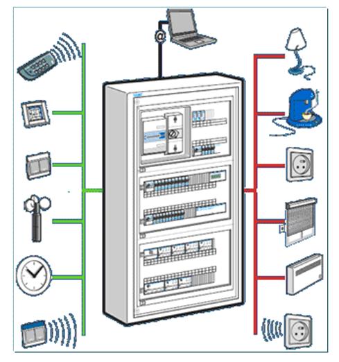 Comme le montre le schéma ci-contre, un réseau EIB/KNX est crée en regroupement les équipements électriques de la maison en passant simplement par l'armoire électrique EDF. Ainsi, ces équipements sont aussi bien des équipements conçu spécifiquement pour fonctionner avec EIB que d'autres équipements plus basiques (électroménagers, ...).