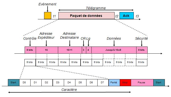 Après l'envoi de chaque caractère, un temps d'attente de 2 bits (Pause) est marqué. Le caractère suivant est ensuite émis et ceci jusqu'à la transmission complète du télégramme. Le récepteur confirme alors, après réception des données et contrôle des parités, que toutes les données ont correctement été transmises.