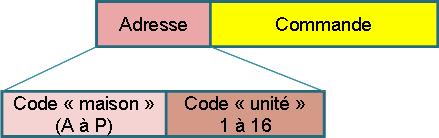 Le protocole X10 est constitué de paquets de 4 bits « house » (code « maison » de A à P) suivis de 4 bits « unit » (code « unité » de 1 à 16) suivis de 4 bits commande. Ce qui offre 256 possibilités d'adressage différentes pour chaque module domotisé.