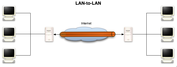 Tout d'abord le LAN-to-LAN qui permet de relier deux réseaux d'entreprises entre eux de façon transparente. Généralement les deux sites ont des tranches IP différentes ce qui oblige les postes clients à passer par le routeur. Celui-ci est directement relié à l'équipement responsable du VPN ou implante directement les protocoles choisit pour la mise en place du VPN.