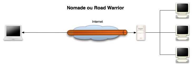 Ensuite, il existe le type nomade, également appelé "Road Warrior" qui permet à un utilisateur distant de son entreprise de se connecter à celle-ci pour pouvoir profiter de ses services. Ainsi, il pourra lire ses mails, récupérer des fichiers présents sur le réseau de son entreprise, ...