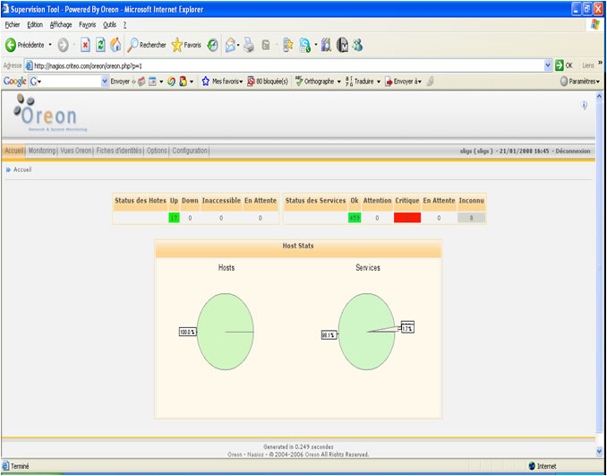 Donc Oreon (centreon depuis juillet 2006) est gratuit et va corriger le principal defaut de Nagios, ses fichiers de configuration.
