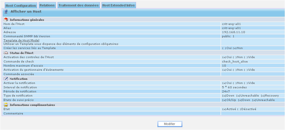 Tout se fait via l'interface et fonctionne par association. Création d'un script pour obtenir une information, création de la commande associée, création du service qui lie la commande à une machine et définie la notification.