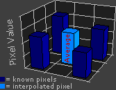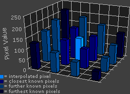 - La technique dite du "Nearest Neighbor" où la valeur du pixel dépendra du pixel le plus proche. En cas d´agrandissement on recopiera la valeur du pixel dans le pixel voisin tandis qu´on fera une moyenne entre le pixel courant et le pixel voisin en cas de réduction.