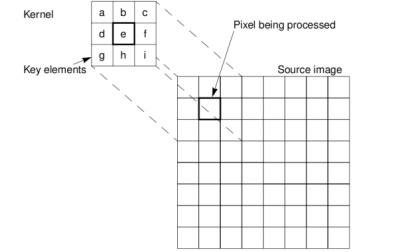 Pour calculer la valeur d´un pixel on centre la matrice sur ce pixel, on multiplie la valeur de ce pixel et des pixels alentours par les coefficients de la matrice, puis on additione ces valeurs et on obtient la nouvelle valeur du pixel considéréré.